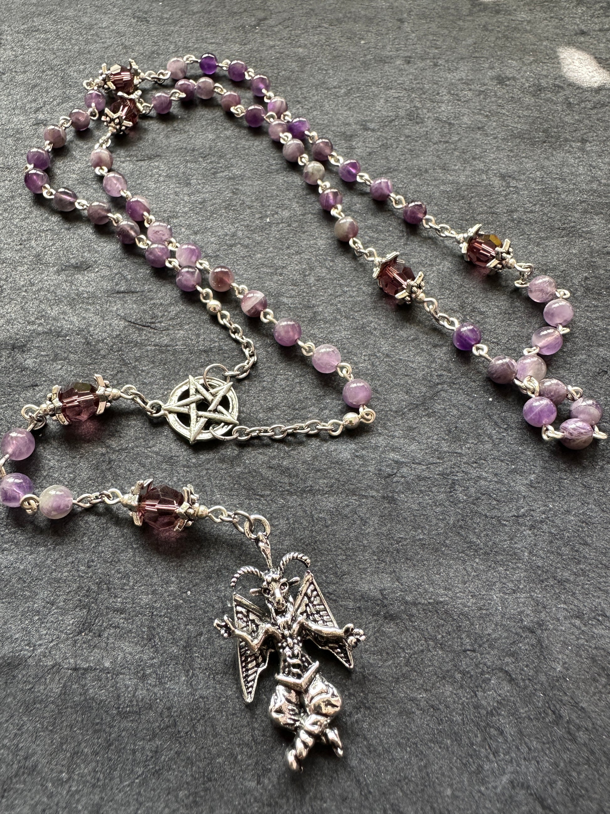 A gorgeous satanic rosary featuring real amethyst beads and gray Swarovski crystals. Purple will always be another favorite color of mine, and the amethyst beads really do this piece justice!