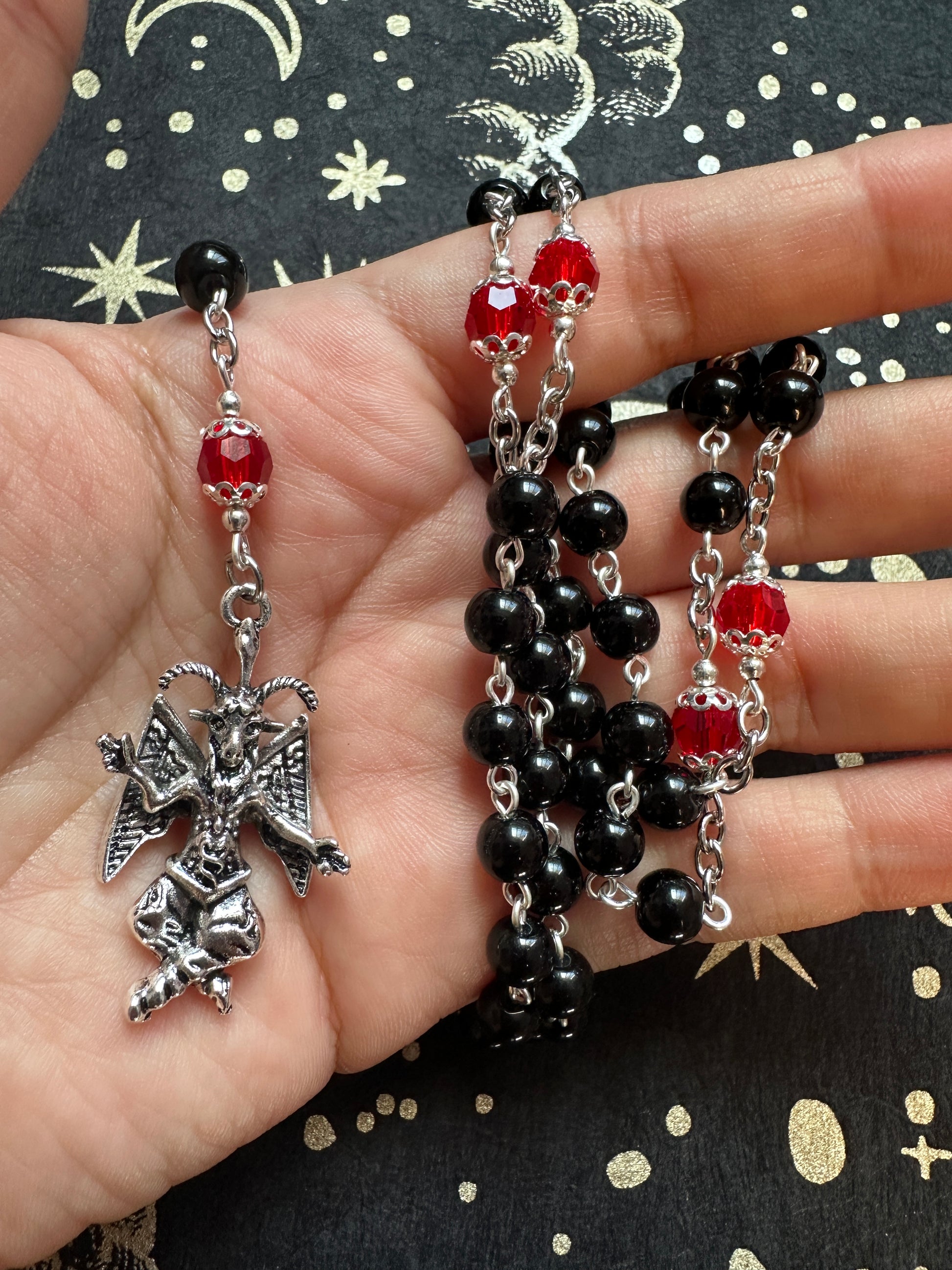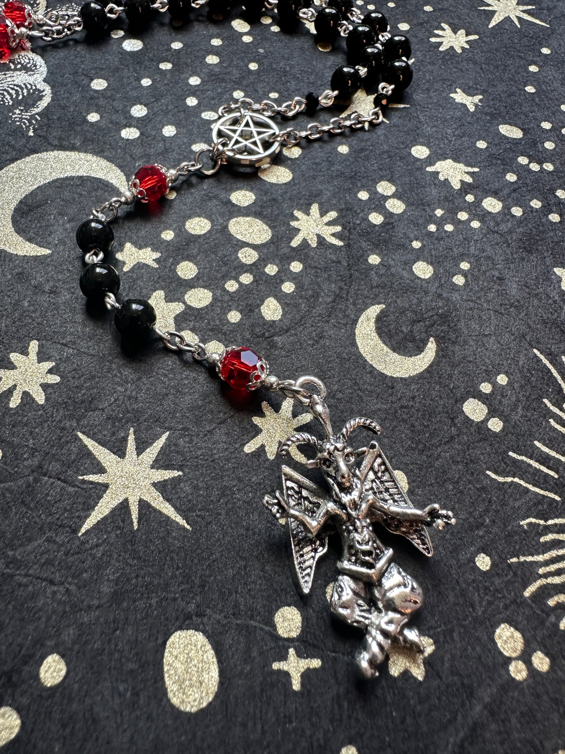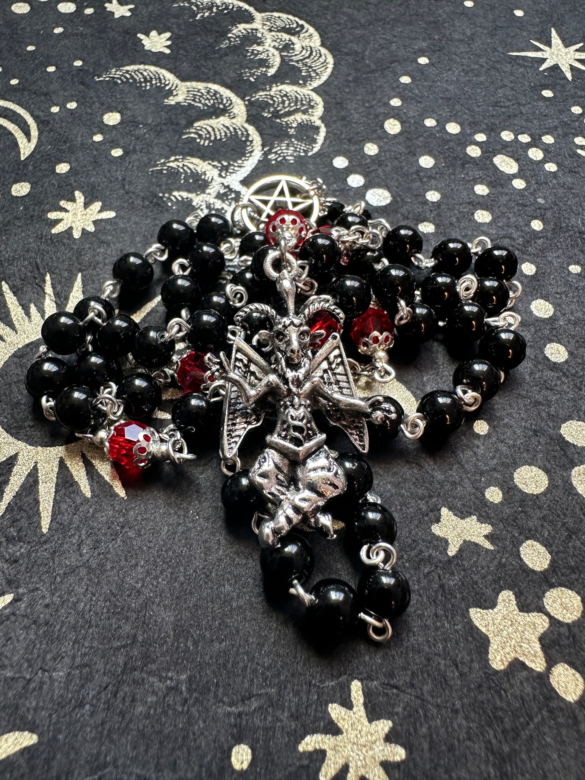 Baphomet rosary with red crystals
