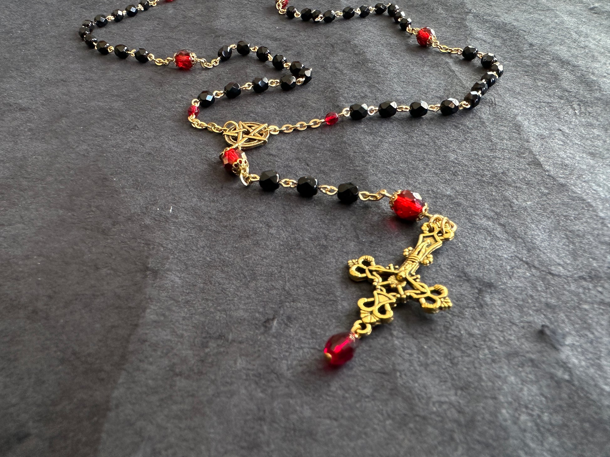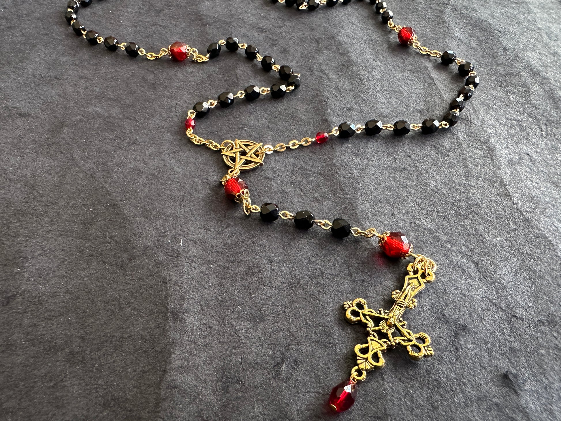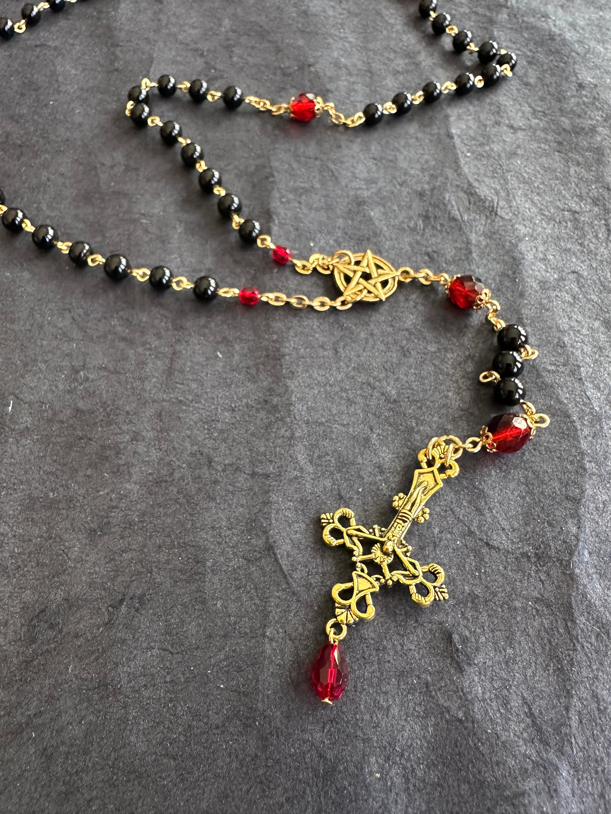 A fantastic, vampiric piece with black glass and gold wirework. Two versions available: one with faceted beads, and one with round beads.