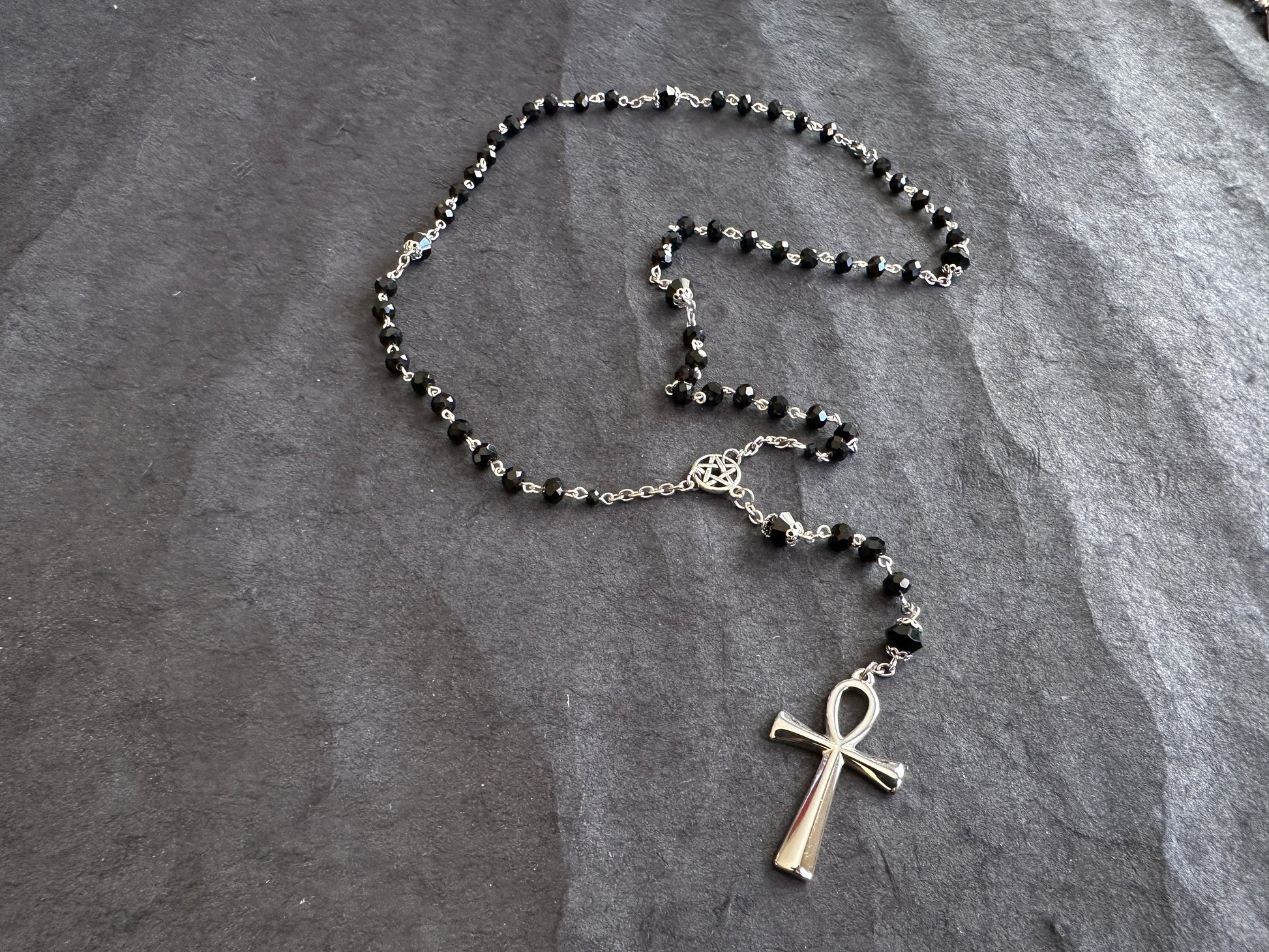 A classic piece that needs no introduction! Made with black glass, a silver-plated center, and a stainless steel ankh. Comes with a little steel clasp for easy wear.