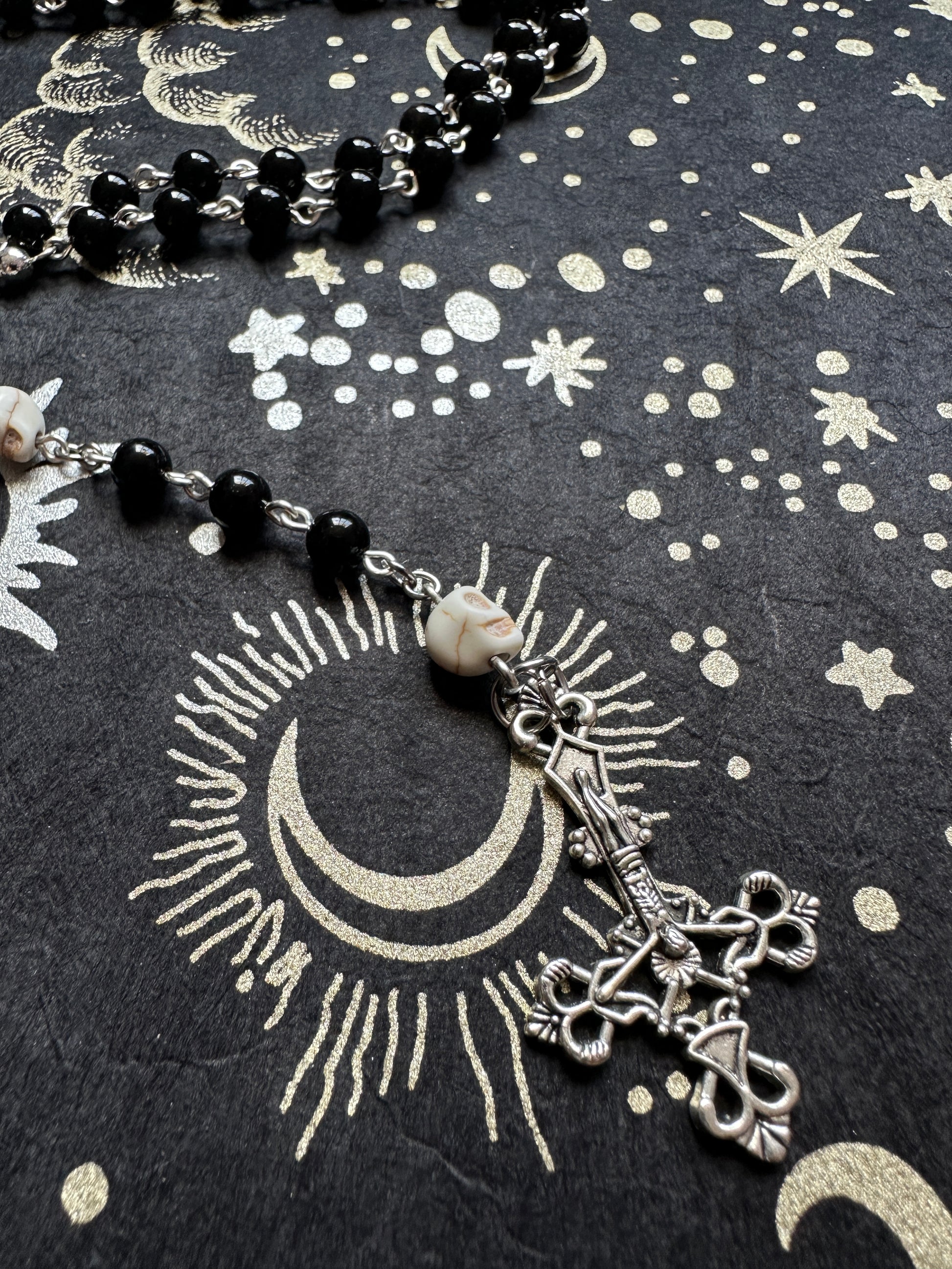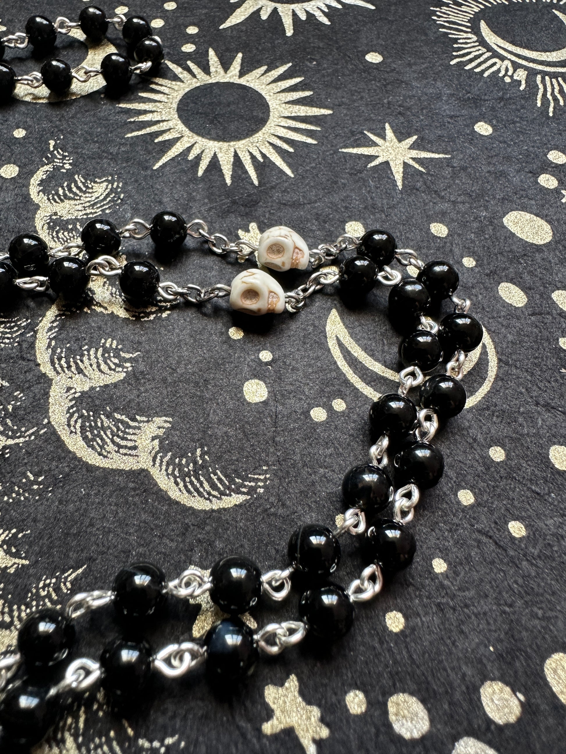 A rosary inspired by death herself; using some delicious black onyx beads, white howlite skull beads, a pewter pentagram, and a silver tone inverted cross. I also added a pair of silver plated hematite beads for an extra shining accent.