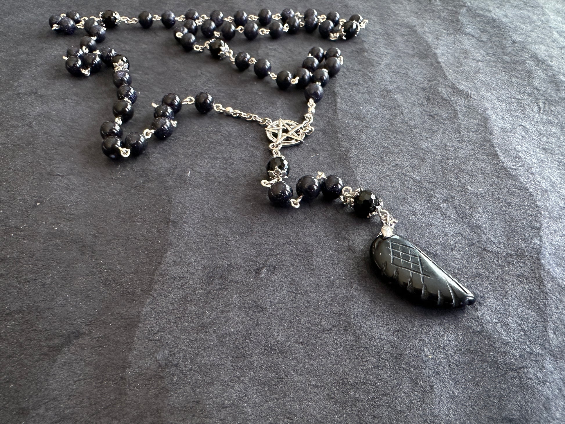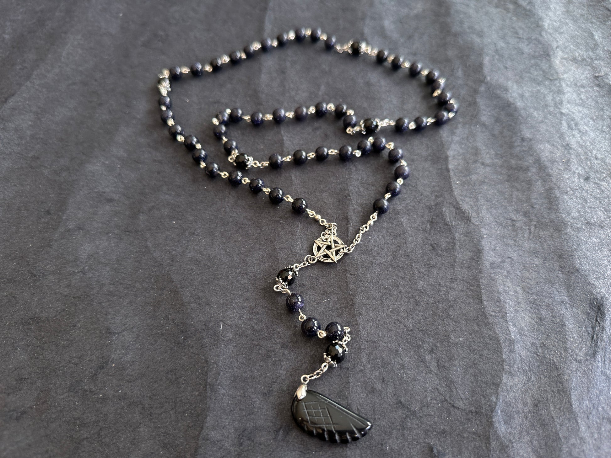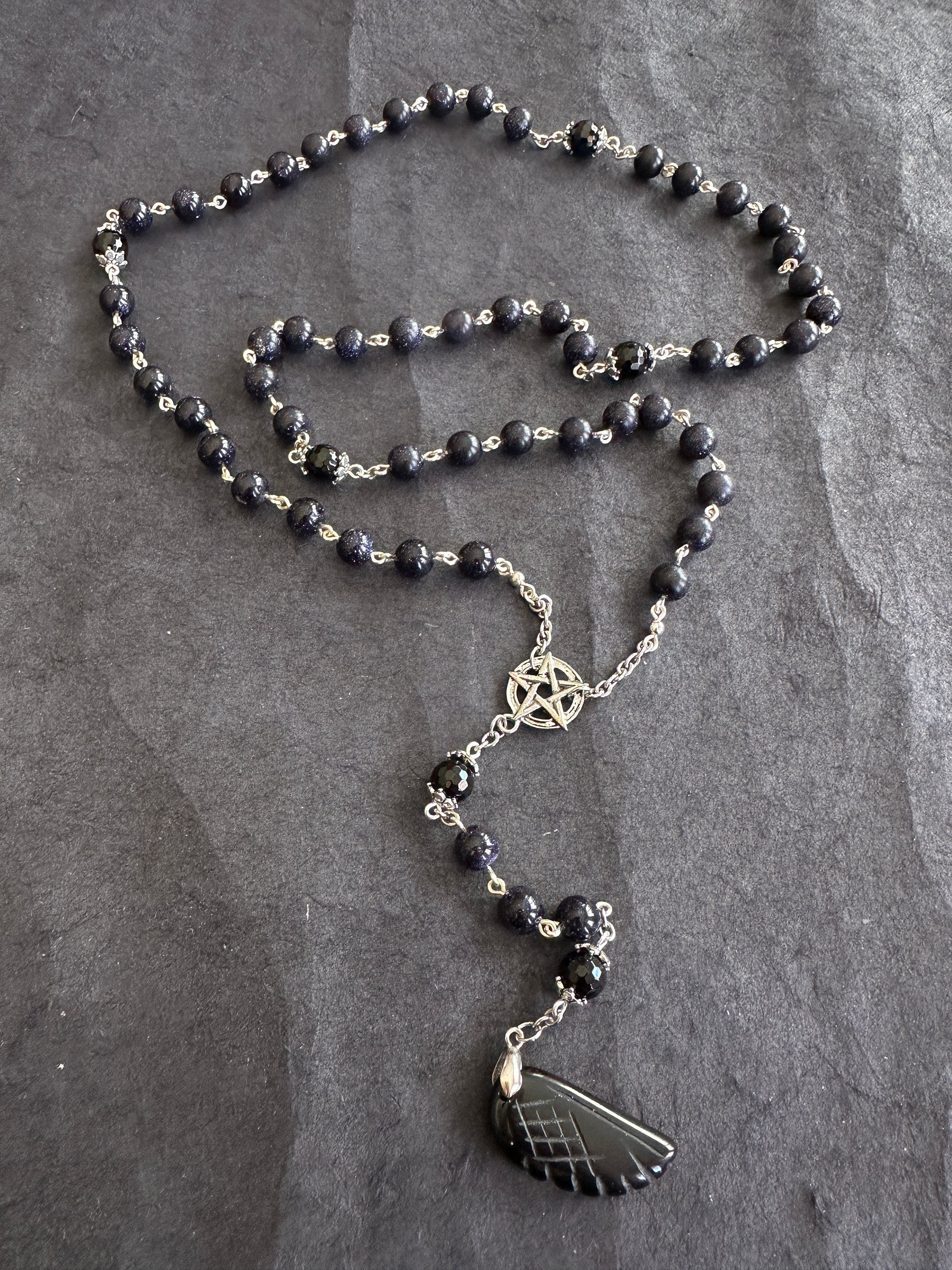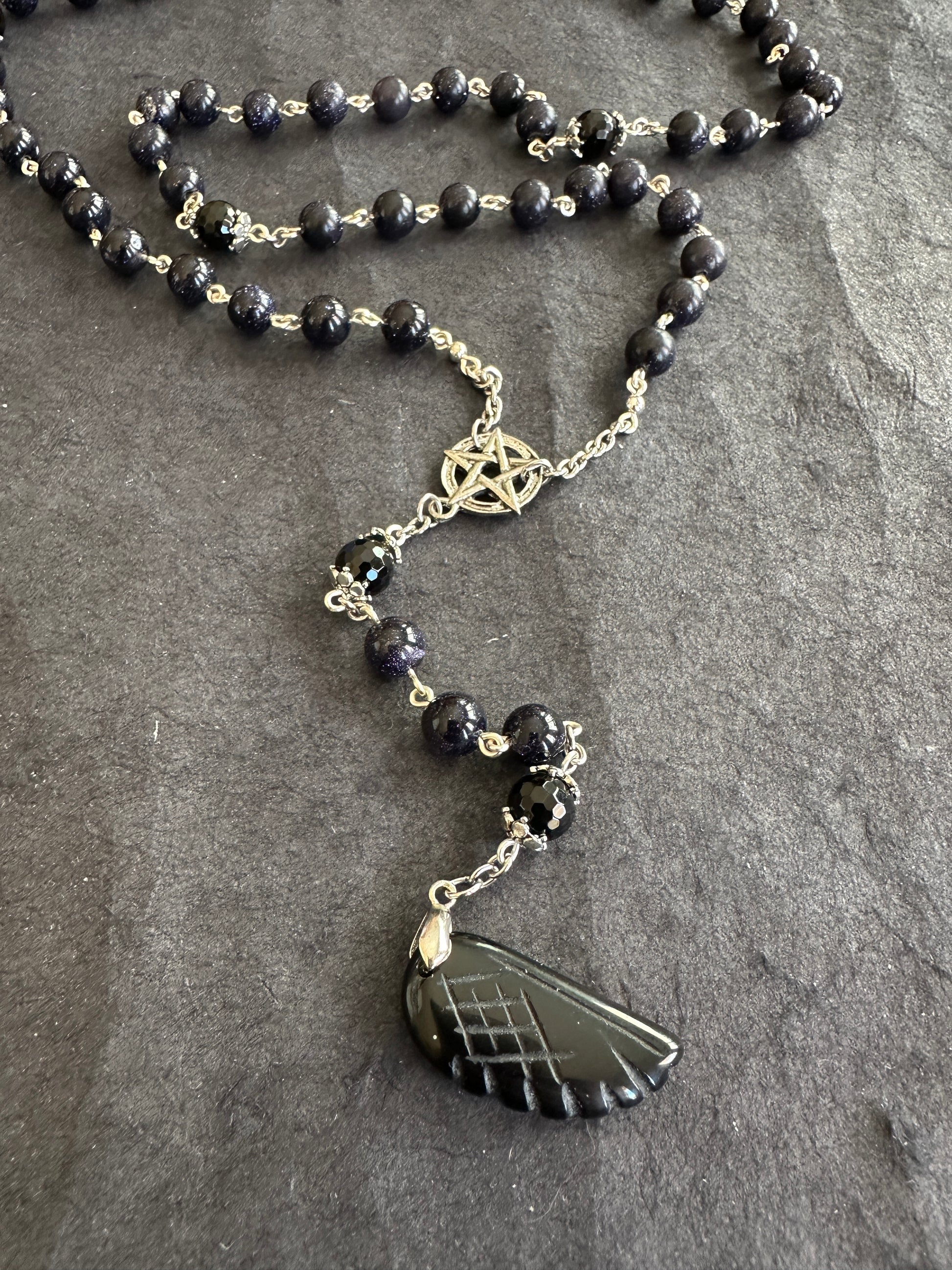 This is a particularly special piece made with blue goldstone and a carved black onyx wing. Perfect for meditation, special events, personal expression, and dark magic.