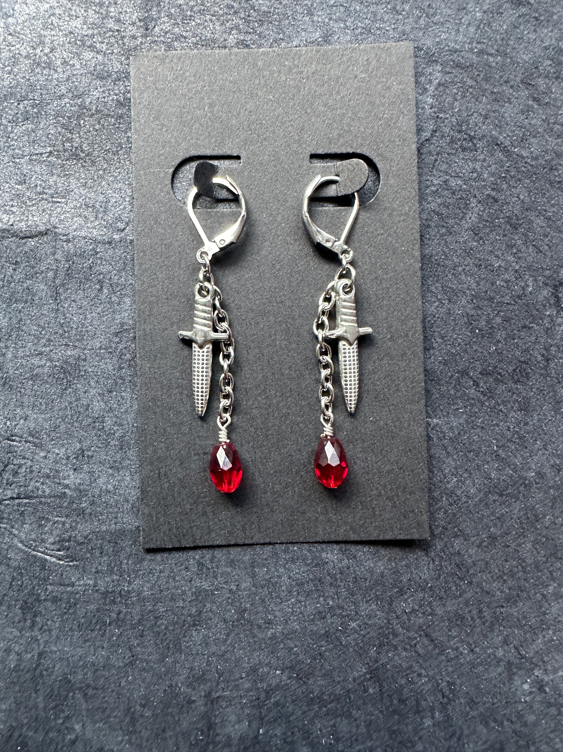 An earring design featuring a stainless steel dagger and a small blood droplet represented by a red glass bead! These earrings are all stainless steel, with lever back clasps. Perfect for those of you that like to wear your dark desires out in public.