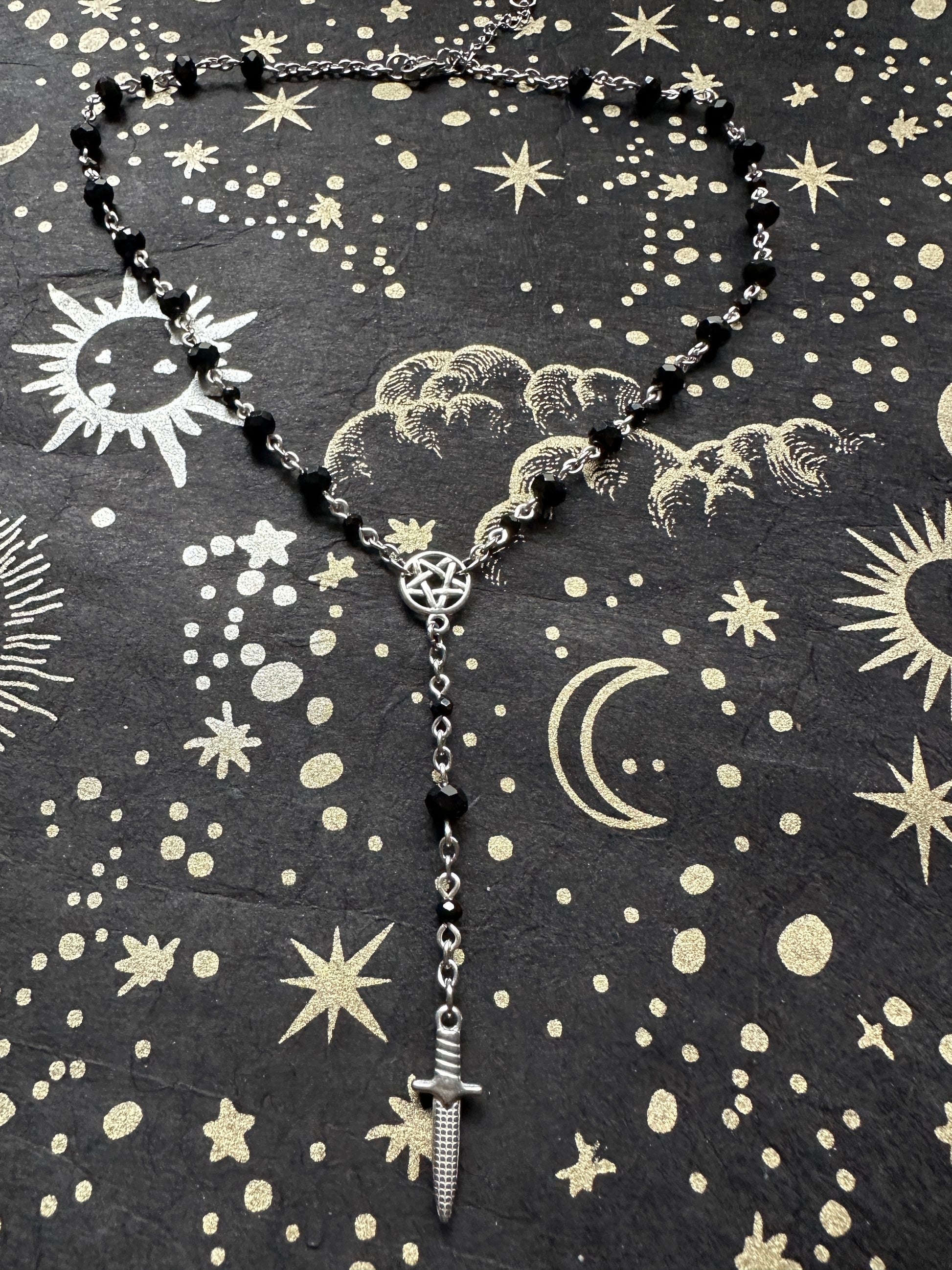 Want something a hair more subtle and dainty, but still shows some teeth? Look no further than this cute little rosary-inspired choker with a dagger charm! The dagger is stainless steel, and all beads are faceted glass!