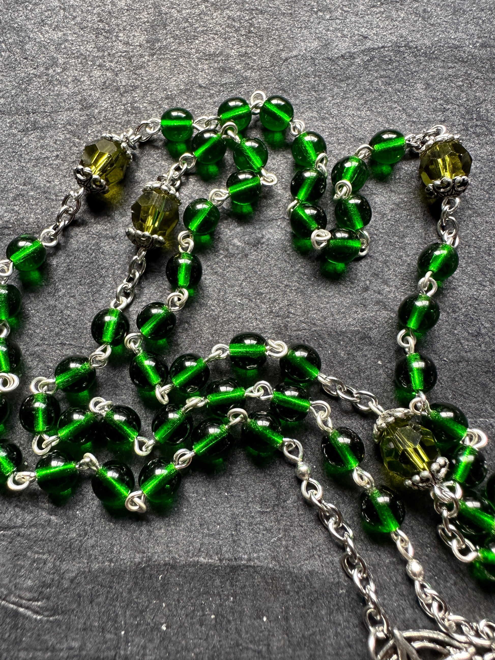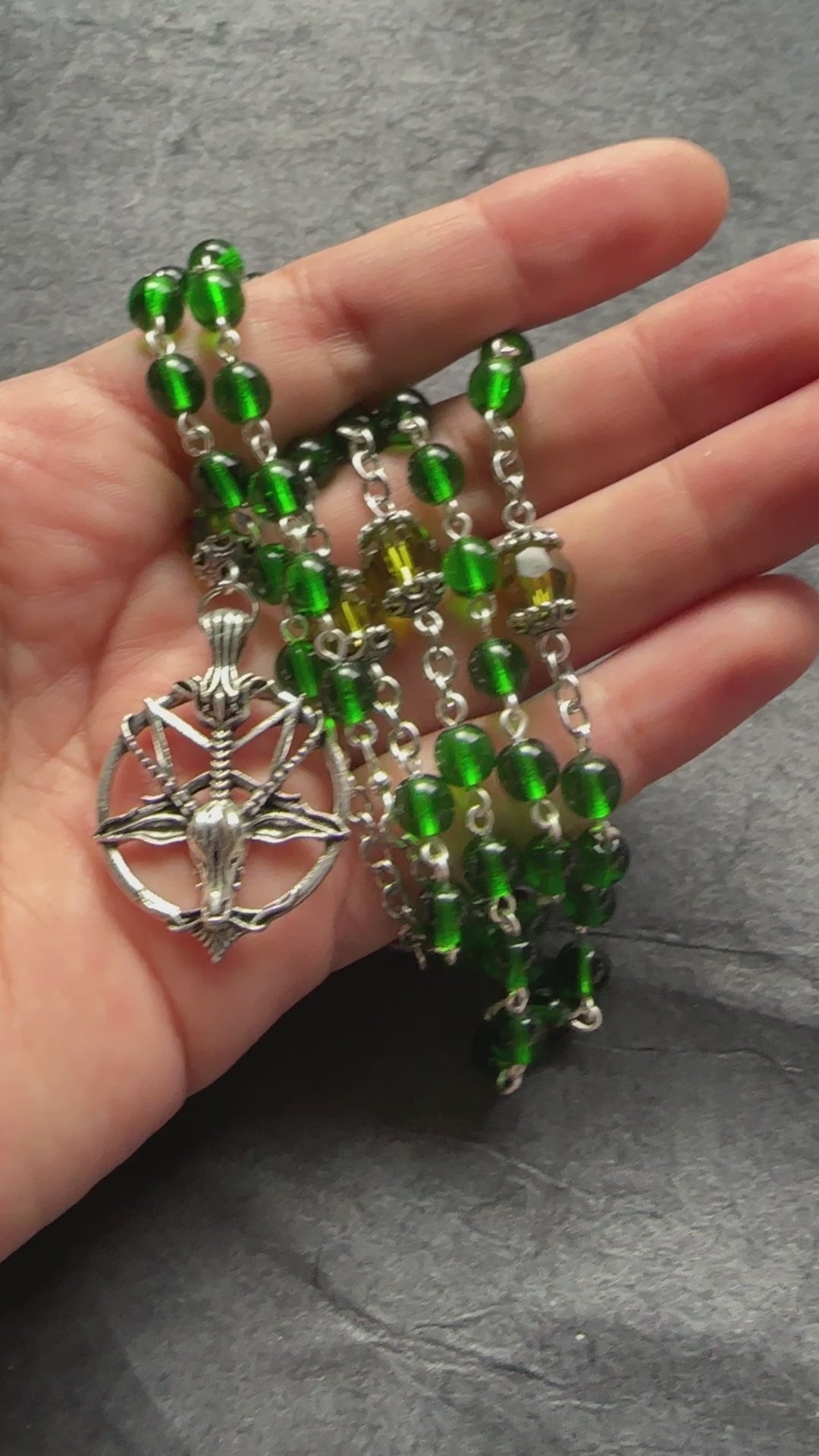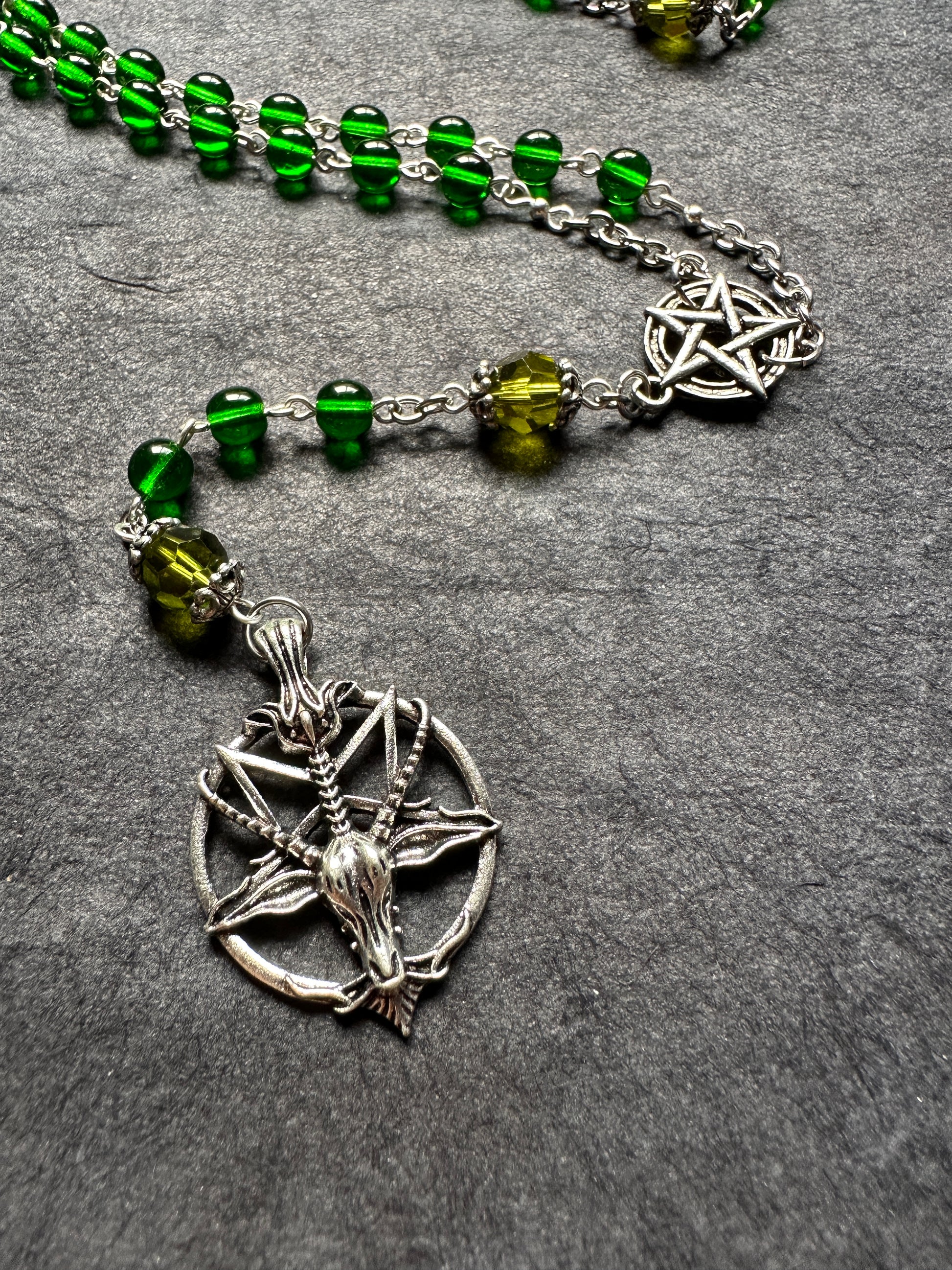 I've long believed that satanic jewelry isn't limited to just red and black. Green is one of my favorite colors; it reminds me of leaves and absinthe. This piece is made with green czech glass beads, olivine swarovski crystals, and pewter pentagram and sigil of baphomet.