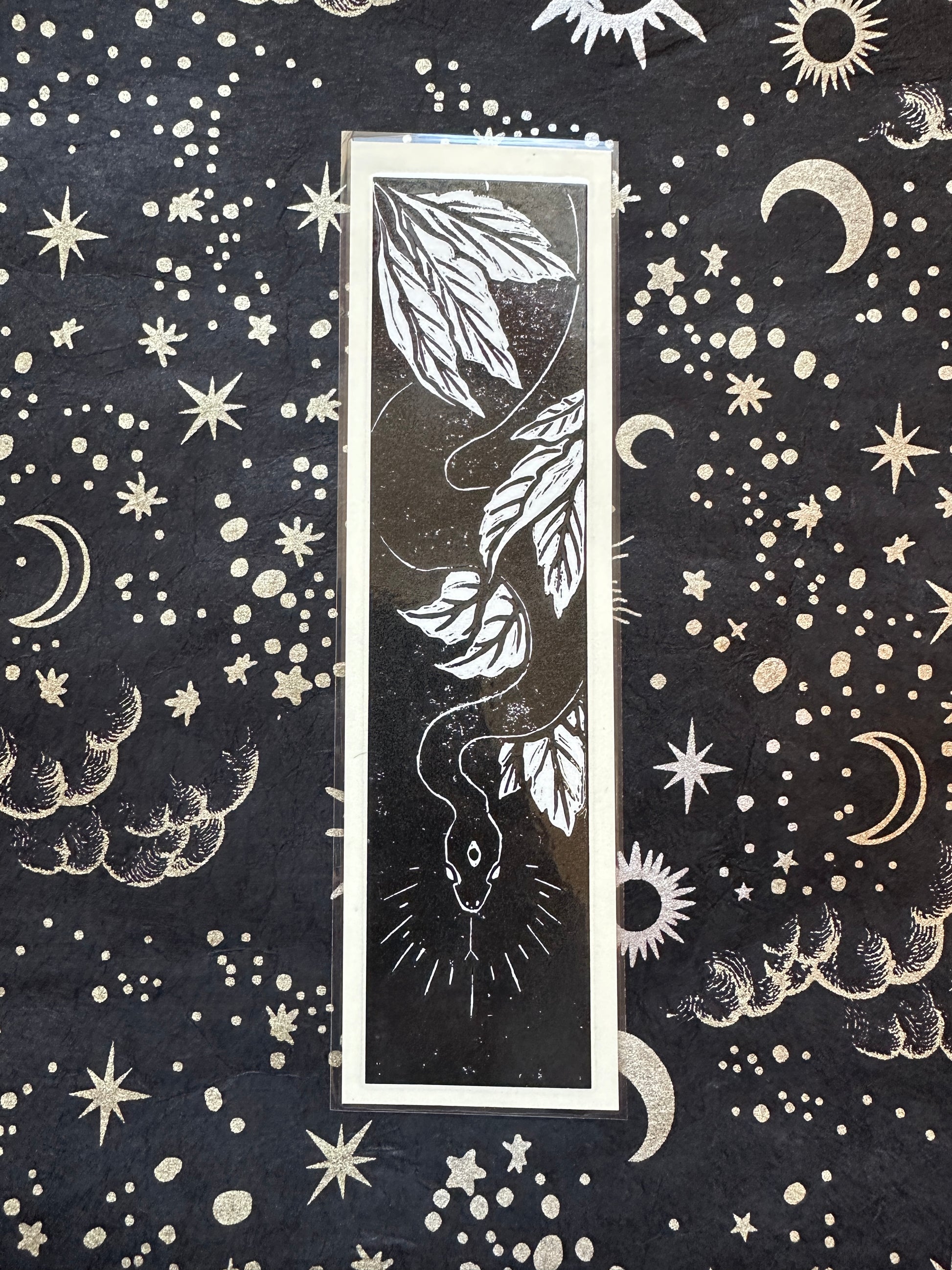 A hand-printed Lino bookmark! Each one is unique and comes with its own print edition number and my signature. Printed on acid-free multimedia paper and laminated onto high-quality cardstock.