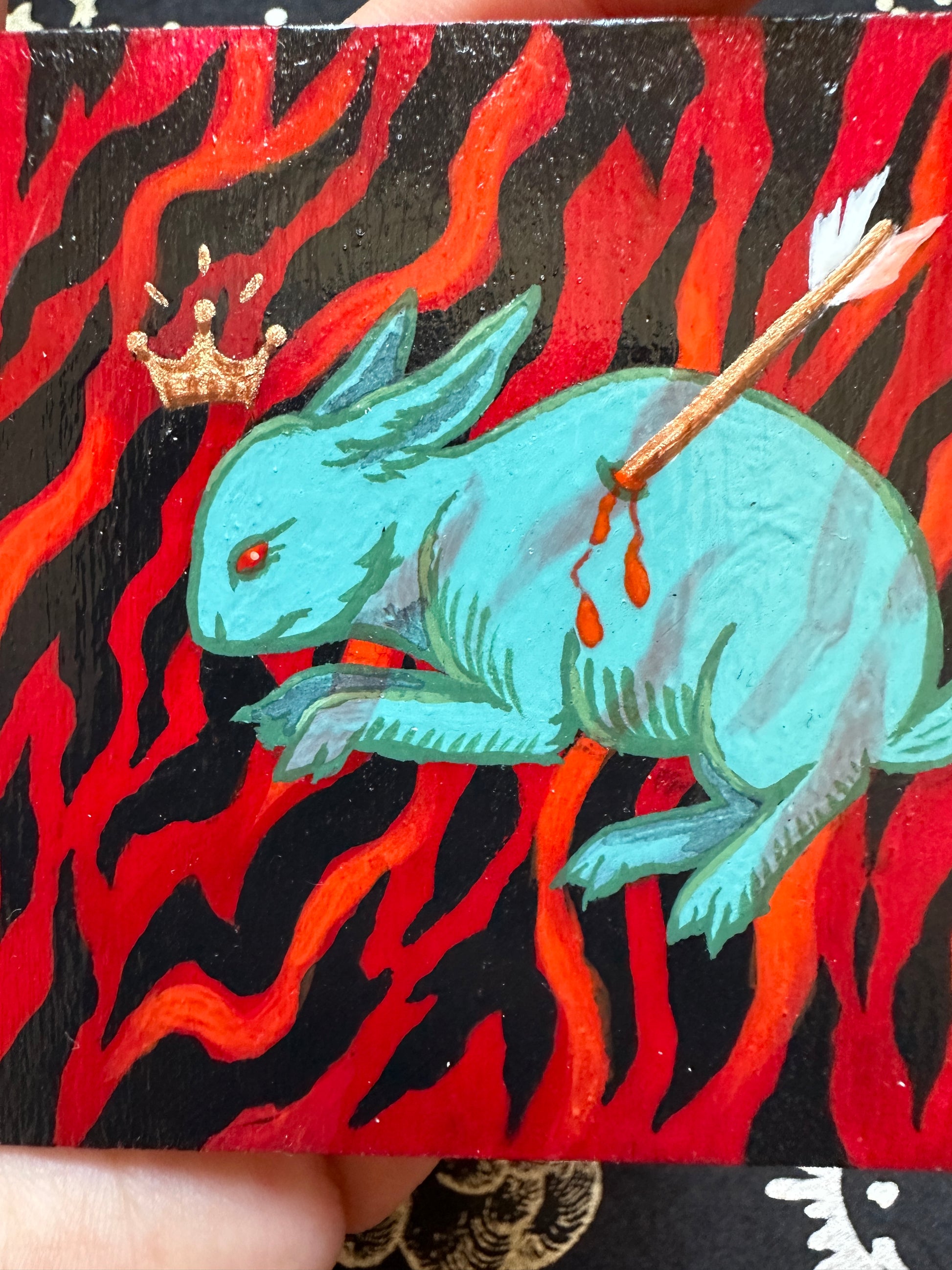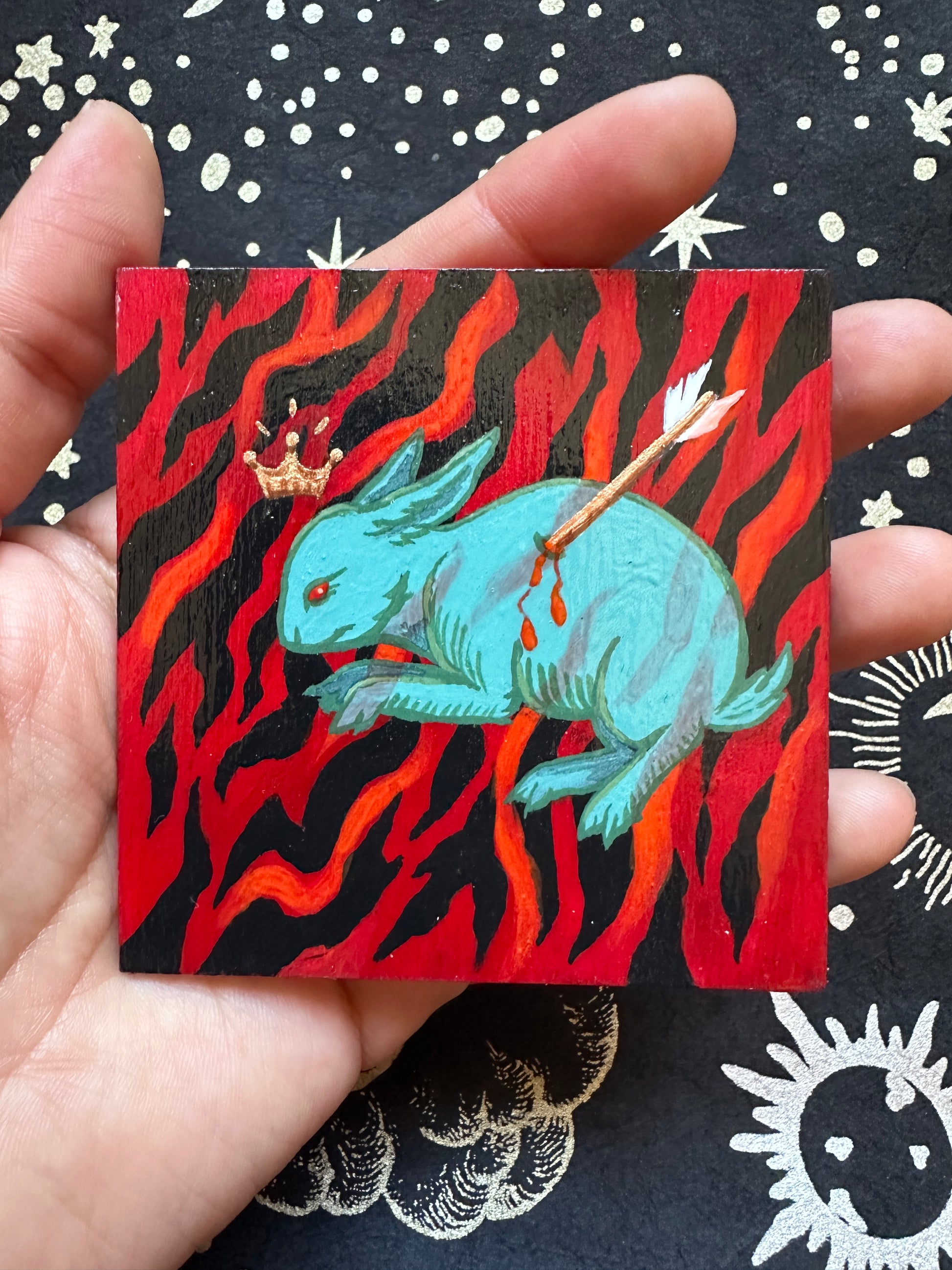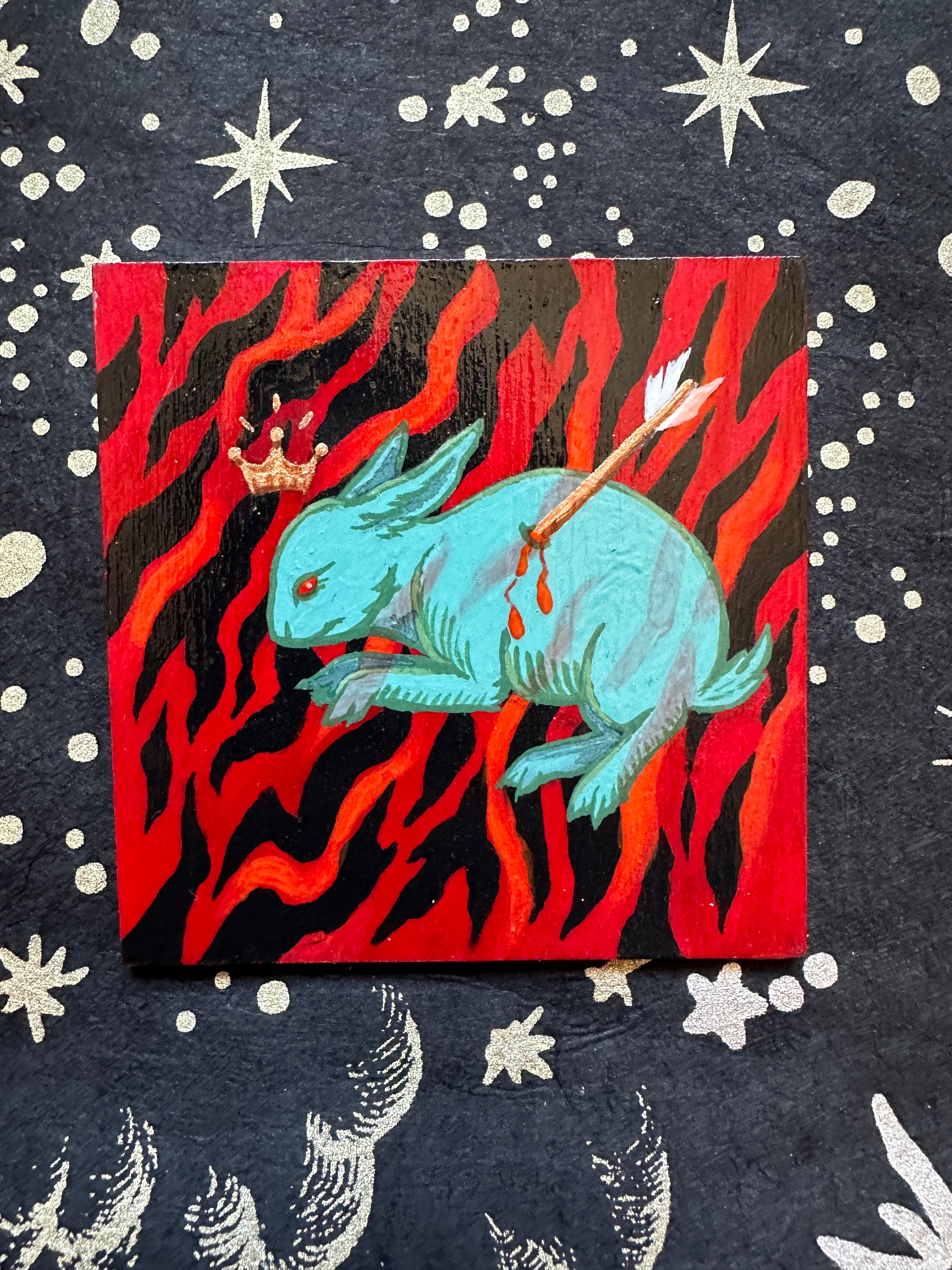 A small painting, done in acrylic paints on a 3inx3in wood plaque.