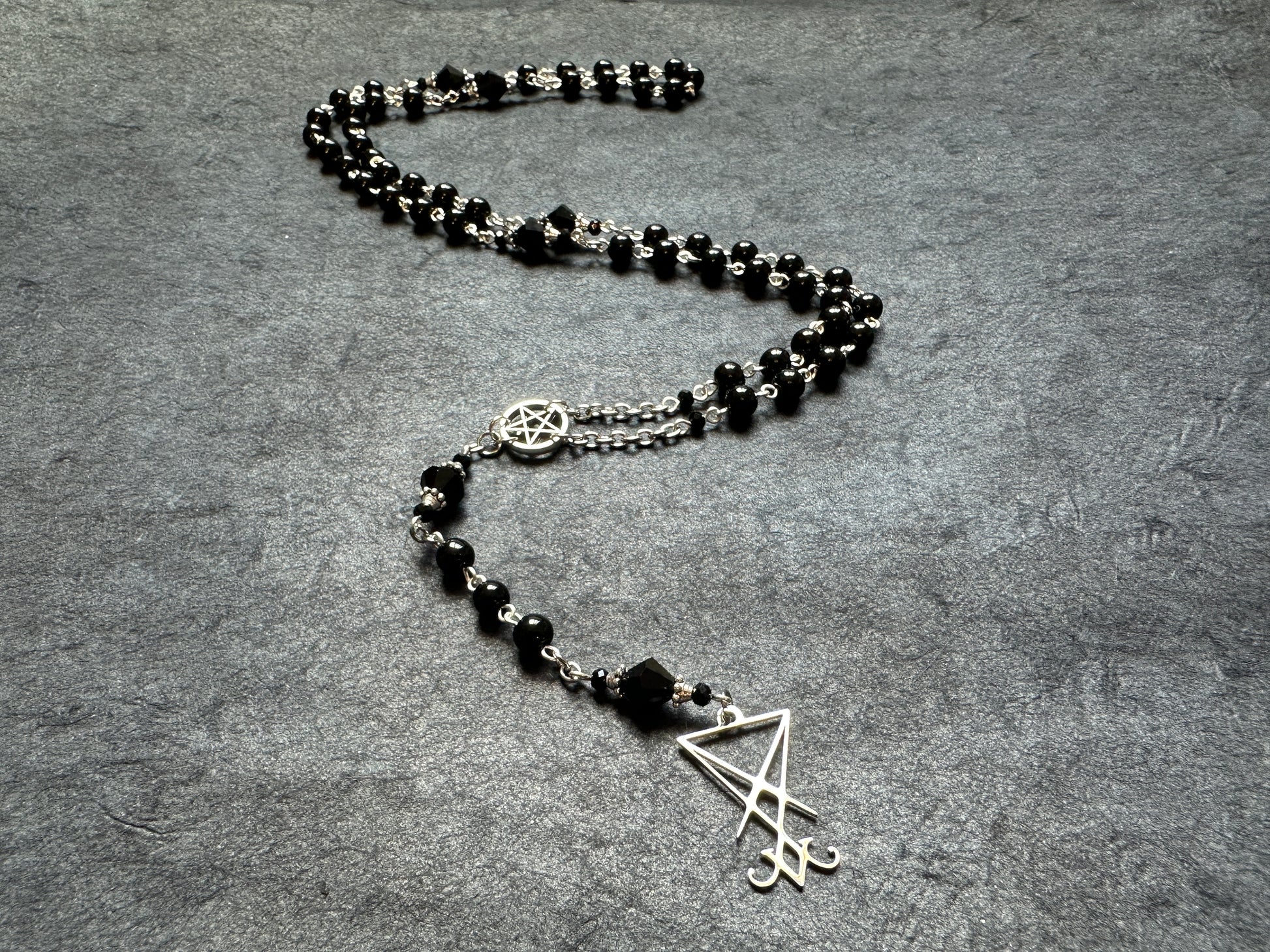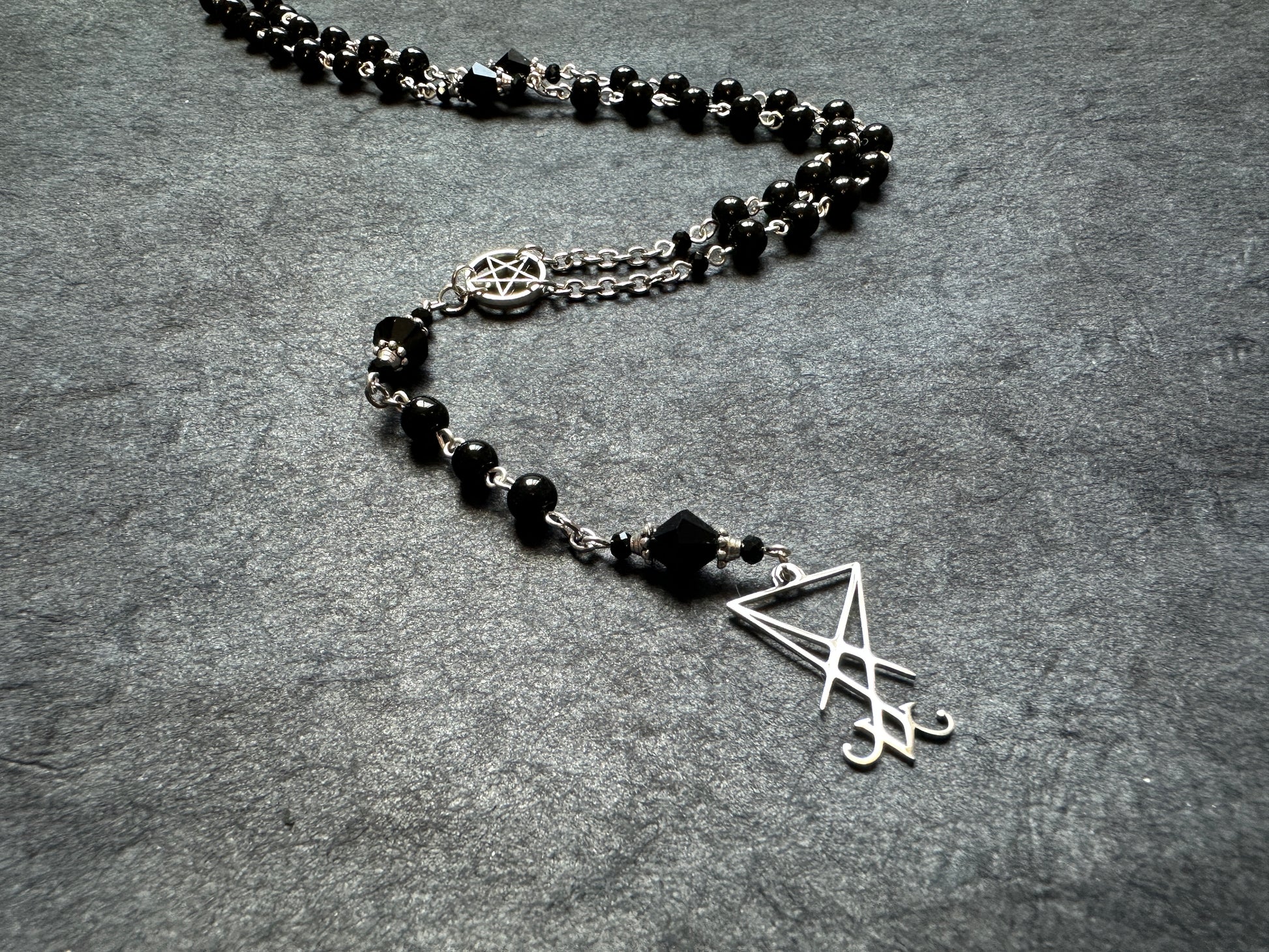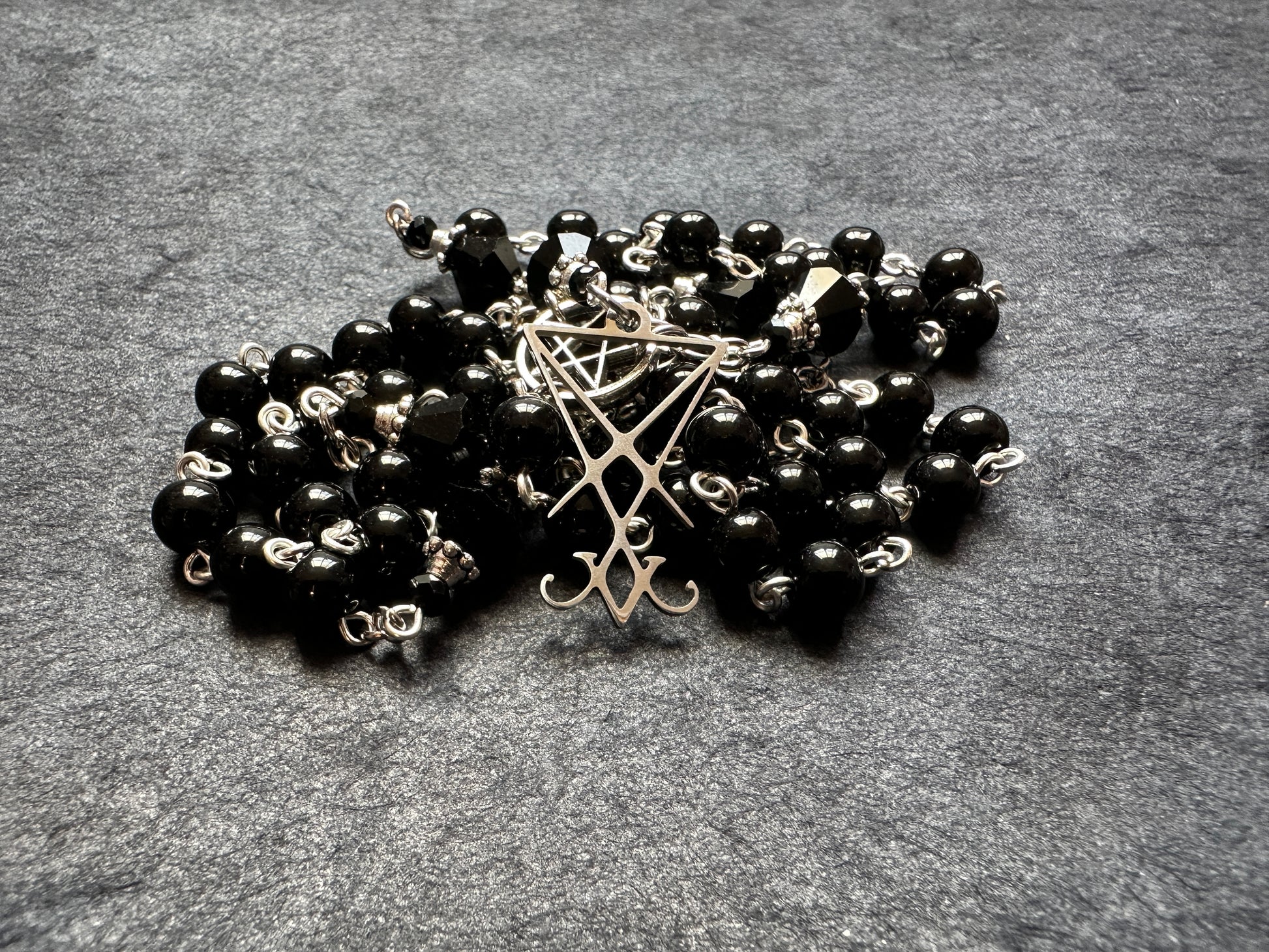 It's a classic for a reason! This black Lucifer sigil rosary is a classic in the shop. Made with black glass beads, jet black crystals, and stainless steel connecting chains and pendant! Makes a great gift, black mass ritual item, or as a gothic fashion statement!
