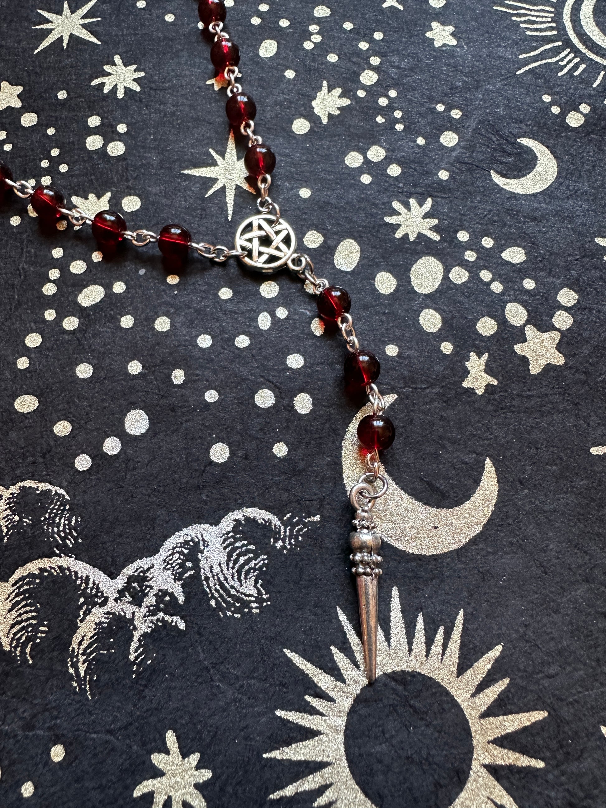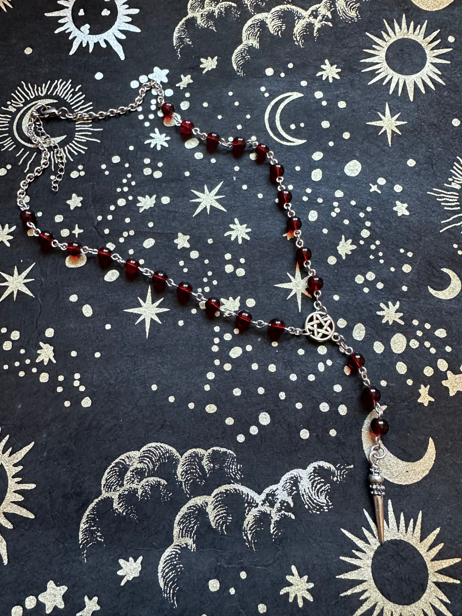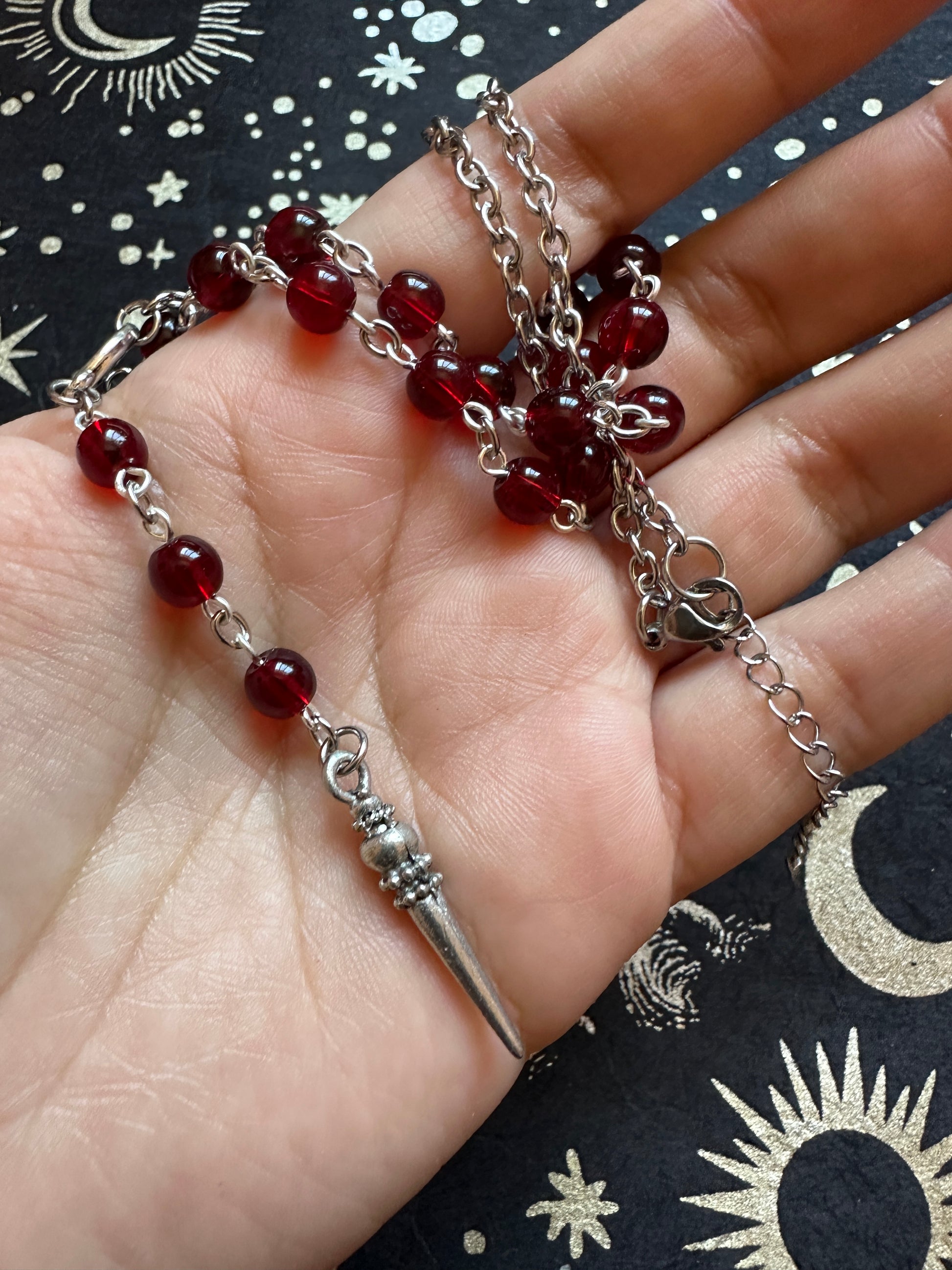 A choker design with gorgeous red glass beads and a pewter spike pendant. If you're looking for something that layers well with other, longer necklaces, this is it! Chain links and clasp are stainless steel.