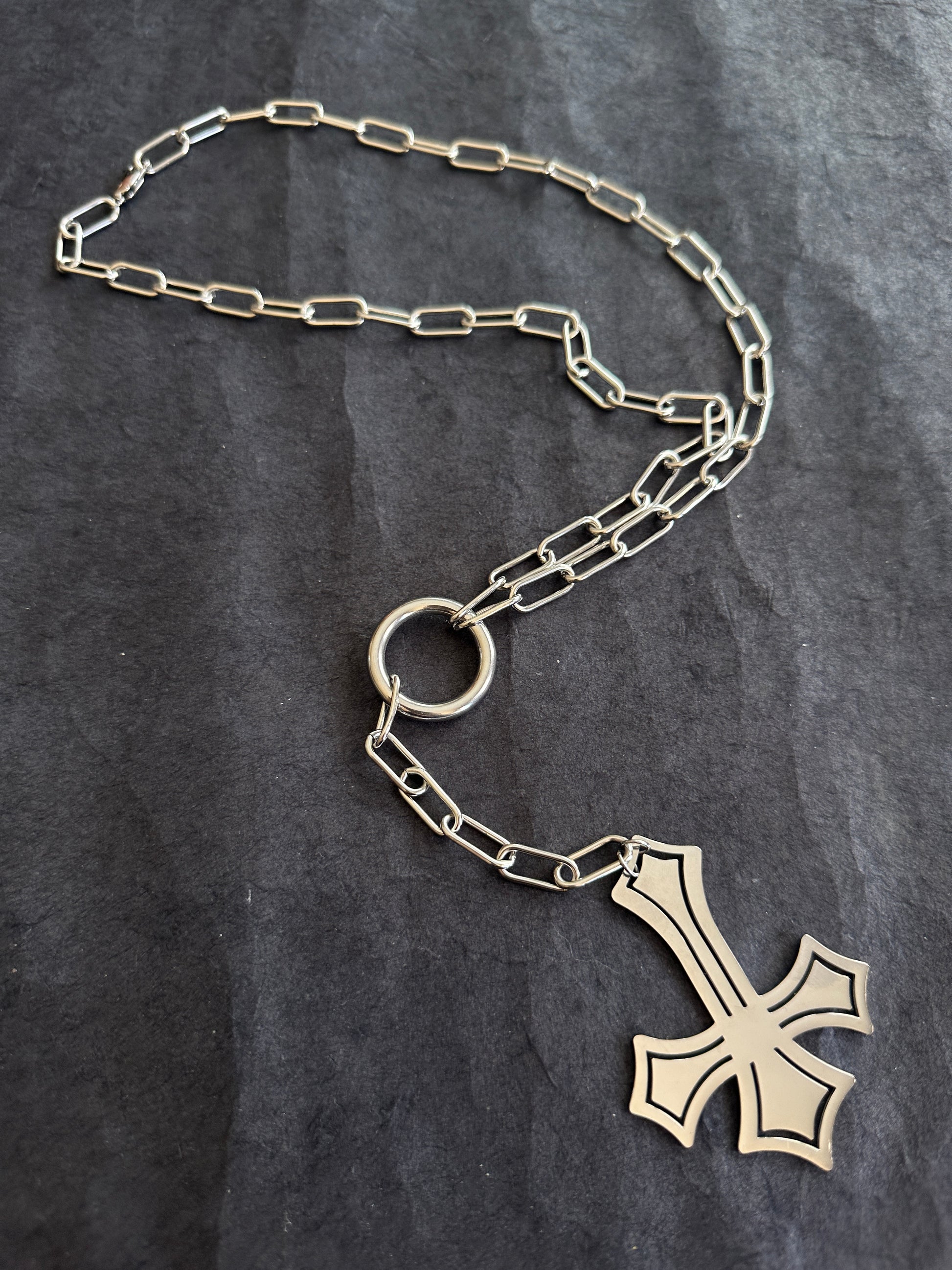 A bold statement piece, this item resembles a rosary and is made with thick stainless steel links and a large stainless steel cross.