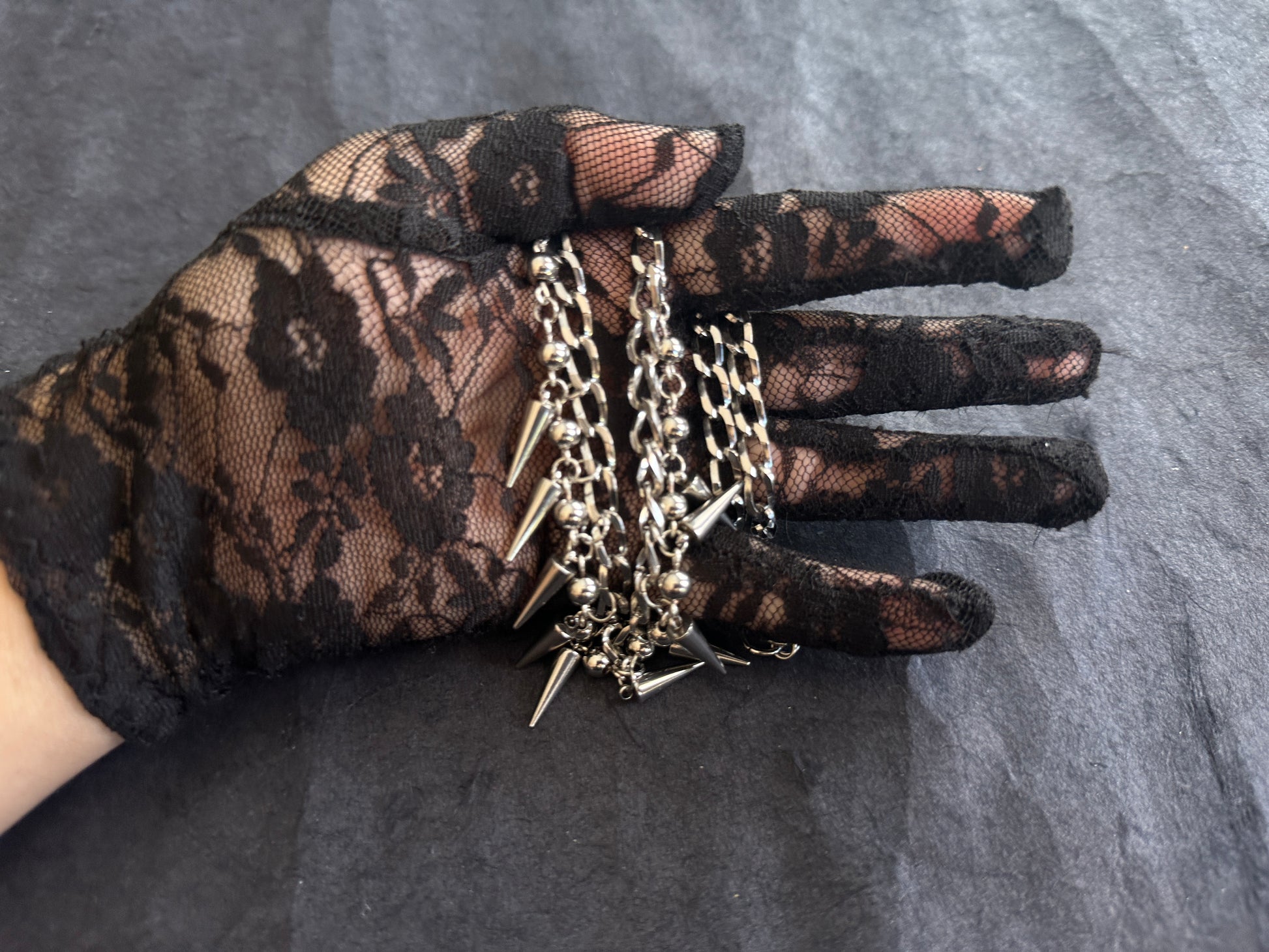 Worn close to the neck, these stainless steel spike necklaces are heavy, fun, and less satanic than my usual wares! Also a popular design.
